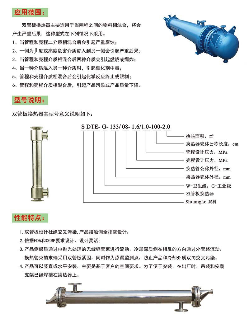 衛生級雙管板換熱器該產品因其體積小、換熱效率高而被廣泛應用于制藥、化工、電子、飲料、半導體等行業,尤其是那些現場空間不足的場合,更突顯產品的優良性能。體積小和換熱性能強,不僅能為用戶提供有效的換熱使用,更能為用戶減少安裝空間,減少安裝、維護費用。